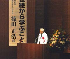 講演は「浮世絵から学ぶこと」と題し、本学特命教授である篠田正浩氏にお願いをしました。氏は「今日は、講義をしに来ました」と宣言するなど、舞台中央でのパフォーマンスもありの熱演の70分。長崎県に4つある各稲門会支部メンバー、在学生父母、高校生等、定員500名の会場が満員になる盛況でした。