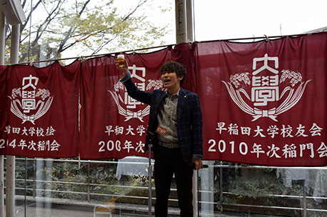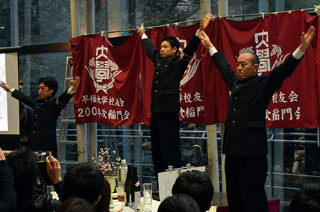各年次稲門会会長11名が舞台の上に。1人ずつ威勢のよいあいさつが続きます。年次ごとに集まったテーブルからは、学生のころに戻ったかのような歓声やかけ声が次々に上がりました。