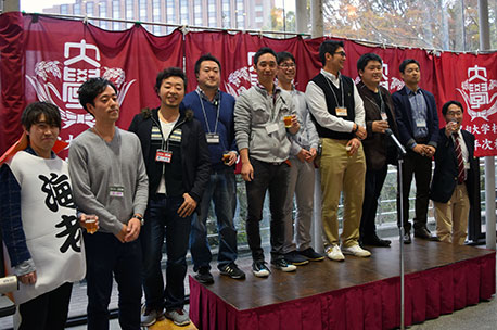 最後はおなじみの校歌・応援歌の斉唱。ステージの上では、各年次の応援部OBが迫力ある演舞を披露しました。音楽がかかると全員が腕を高らかに上げ、校歌、『紺碧の空』の大合唱。学生時代のような空気に包まれました。閉会後、一同は年次ごとに分かれ、2次会会場へ。大盛り上がりの一日となりました。