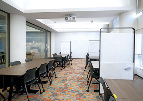 グループ学習室。外部とはガラスの遮音壁で区切られており、話し合ったり、声を出して語学の勉強をしたりすることができる。可動式のテーブル、椅子、ホワイトボードは人数に応じて動かすことができ、プロジェクターも設置されている