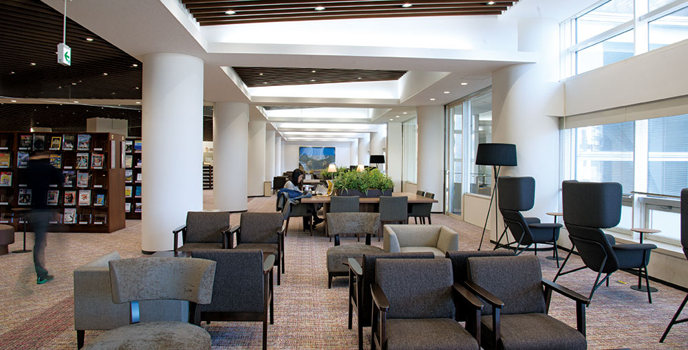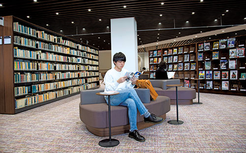 2019年4月にリニューアルオープンした中央図書館。会話やパソコンの使用が可能で、ふた付きの飲み物の持ち込みも許可されるLC(ラーニング・コモンズ)は、「クリエイション(2階)」「ディスカッション(2階)」「ブラウジング(3階)」「ワーク(3階)」と目的別に設計された四つのエリアに分かれ、学生は作業内容に合わせて座席を選ぶことができる。