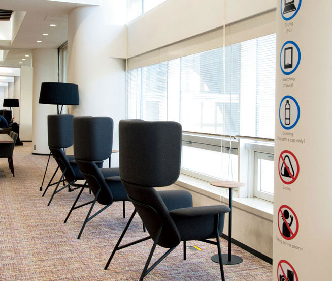 ブラウジング(コモンズ3)。ソファやハイバックチェア、個人用のテーブルが設置され、長時間滞在できるように設計されている