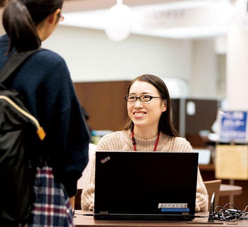 「LA(ラーニング・アシスタント)デスクで学生をサポートしています。資料探しはパソコンでも可能ですが、『どのような資料にあたればいいかが分からない』という学生の声を聞き、探し方を提案するのが私たちの役目です。約5人のスタッフがローテーションを組んで担当し、1人~2人のスタッフが常駐しています。学生と話すと、自分の研究にも役立つ気付きがあるので刺激的です」 佐藤早樹子(文研博後4年)