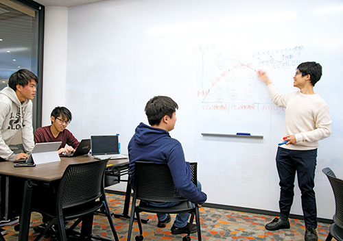「ゼミのメンバーで発表の準備をするとき、グループ学習室を利用します。壁一面のホワイトボードを使って、意見を出し合いながら概念図やプレゼンシートをまとめられますし、学内Wi-Fiを使用して、各自のファイルを共有することもできるので便利です」 高山聖明(政経4年)、出雲雄人(政経4年)、國原悠杜(政経4年)、高橋昂大(政経4年)