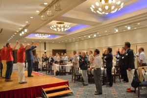 第3部の懇親会は、鈴木幹事の進行で開宴。来賓の方々も会員と同席、アルコールが進むと共に会話が弾み、和やかな宴となりました。早稲田祭運営スタッフ2名も参加し、学生と校友との交流や、テーブル対抗「早慶○×クイズ大会」では、真剣な顔と正解時の子どものようなはしゃぎっぷりが印象的であった。そして景品をいただき大喜び。最後は、小川副会長のリードで校歌を高らかに歌い上げて散会。