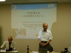 今回は当会会員で早稲田大学政経学塾員名誉教授・日本農業大学校校長の堀口健治氏(1965年政経)から「TPPを考える―日本農業のこれから」と題して講演をしていただいた。最初に、TPPの本質は自由貿易協定ではなく管理貿易協定であり、米国企業の企業利益のための協定であること、農業についていえば、牛肉・豚肉・乳製品は大きな影響を、米・麦はある程度影響を受けるだろうとお話しされた。その後、日本農業大学校の紹介をされながら、今後の農業について述べられた。各県に設けられている農業大学校が個別の農産品を対象とした農業技術教育を行うのに対し、同校は農業版MBAを目標に4年前に設立され、経営力を中心に人間力・社会力・農業力を2年間の全寮制教育で行っていること、1学年20名だが、20歳代、非農家、非農学系大卒がそれぞれ約半分という構成で、卒業した1期生、2期生の中には独自の経営で成功している人もいるとのこと。また、ITと農業の親和性は良く、多くの成功事例も出ていることなどを紹介していただいた。