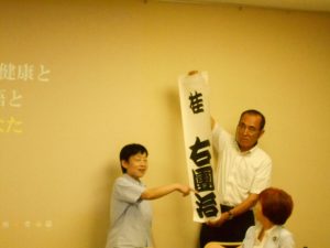 今回は校友で女性落語家の桂右團治氏(1988年法学)に「笑いと健康」と題して講演をお願いした。最初に寄席文字で書かれたご自身の名前を披露されながら、白い部分が少なく黒々と書かれているのはお客さんがたくさん入って席の余白がないことを願ってであるということ、また前座、二つ目、真打合わせて落語家は650名ぐらいでそのうち女性は20名ぐらいであるということ、落語とは「落ちを語る」ということでその起源は戦国時代のお伽衆、江戸時代に庶民の笑い話を京都の僧侶、安楽庵策伝がまとめた「醒睡笑」と言われ、その後上方で大道芸として始まり、江戸に下ってからは大名や大店のお座敷芸として発展したので、今も東京と大阪でその違いの一端を見ることができるということなど、落語にまつわる豆知識をいろいろと教えていただいた。本題の笑いと健康では落語を聞いたときに血圧が下がることの実証実験の結果や、大声で笑うと腹筋を使った腹式呼吸になるので酸素摂取量が通常の3倍になること、また脳内では神経伝達物質のドーパミンが増えて活動的になることなどが分かっているとのことであった。