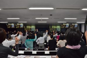 3つのイベントは、ホームカミングデー式典から始まりました。ホームカミングデー式典は、3号館402教室のサテライト会場が集合・聴講場所となりました。会場には、約150名が集まり、中継映像を通して、総長、来賓の方々のお話を聞きました。サテライト会場では、大学の方より、授業への高い出席率など最近の学生事情のお話があり、非常に興味深いものでした。そして、最後はもちろん久しぶりの早稲田大学校歌の斉唱で盛り上がりました。