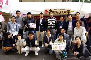 稲門祭での牛タンつくね串焼き屋台は、今年は7号館北側の通路に出店しました。販売したのは、東松島市産品の牛タンつくね串焼きと松島梅サイダー。今年は宮城県への支援を共通の目的とする社会科学部 卯月ゼミとの共同出店となりました。屋台には多くの先輩、同輩、後輩に来店いただき、前回の稲門祭出店時を上回る600本の串、梅サイダー120本を完売しました。