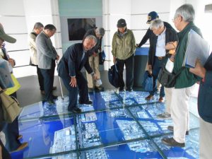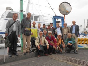 2017年10月6日朝9時30分、川崎駅前に今回は“おじさん”だけが集合。約40分のバス乗車で個性的な建築の川崎マリエン(川崎市港湾振興会館)に到着。天候はあいにくの雨だったが、10階展望室から視界360度の眺望と眼下の川崎港を一望しつつ、港湾局OBの案内の方から江戸時代の歴史と、埋め立てへ変化を遂げた過程や港の変遷の説明を受けた。うっすらと房総半島も見える。三井・東洋埠頭などの民間管理と川崎市管理の違いや、原油などを運び込む海上係留施設シーバースの話に興味深くうなずく参加者。