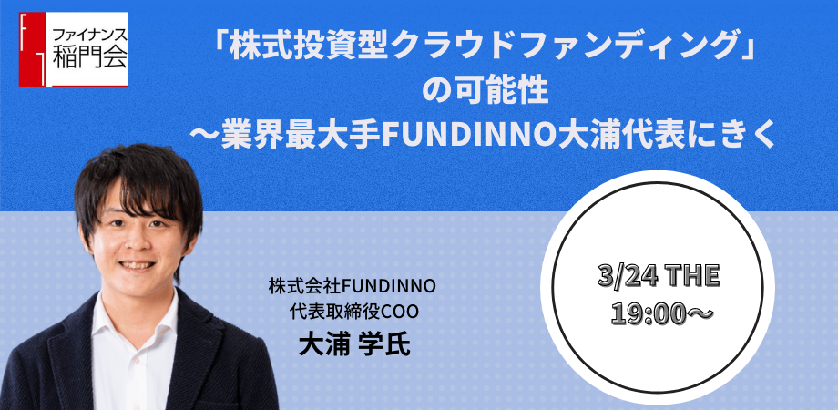 ファイナンス稲門会:オンラインセミナー「株式投資型クラウドファンディング」の可能性 ~業界最大手FUNDINNO大浦代表にきく」開催