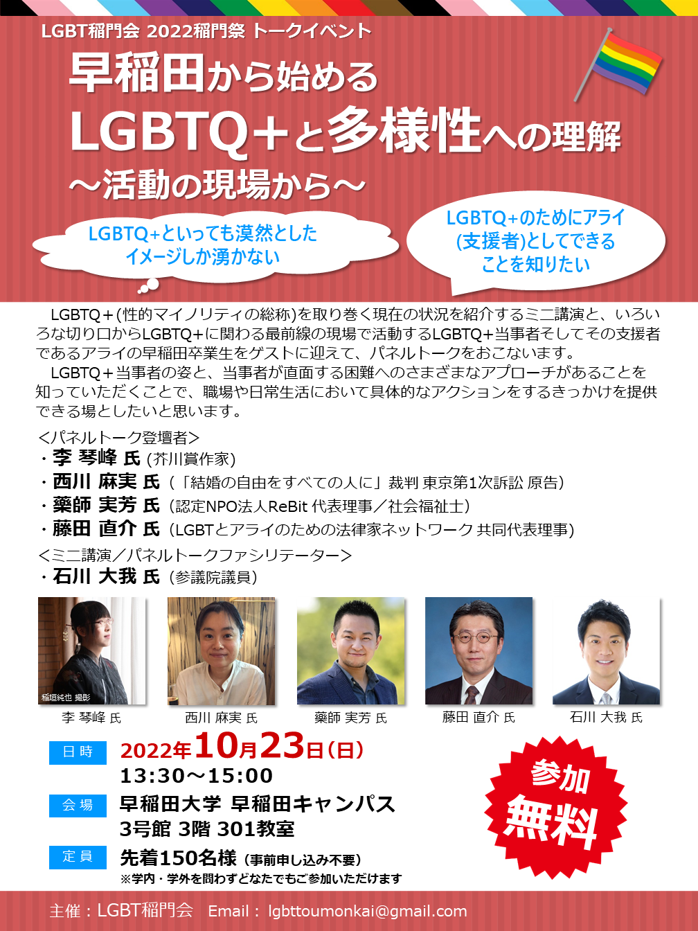 LGBT稲門会では来る10月23日(日)に開催される「2022稲門祭」で、『早稲田から始めるLGBTQ+と多様性への理解 ~活動の現場から~』と題し、LGBTQ+にかかわる最前線で活動する早稲田卒業生の方々をお招きし、トークイベントを開催いたします。