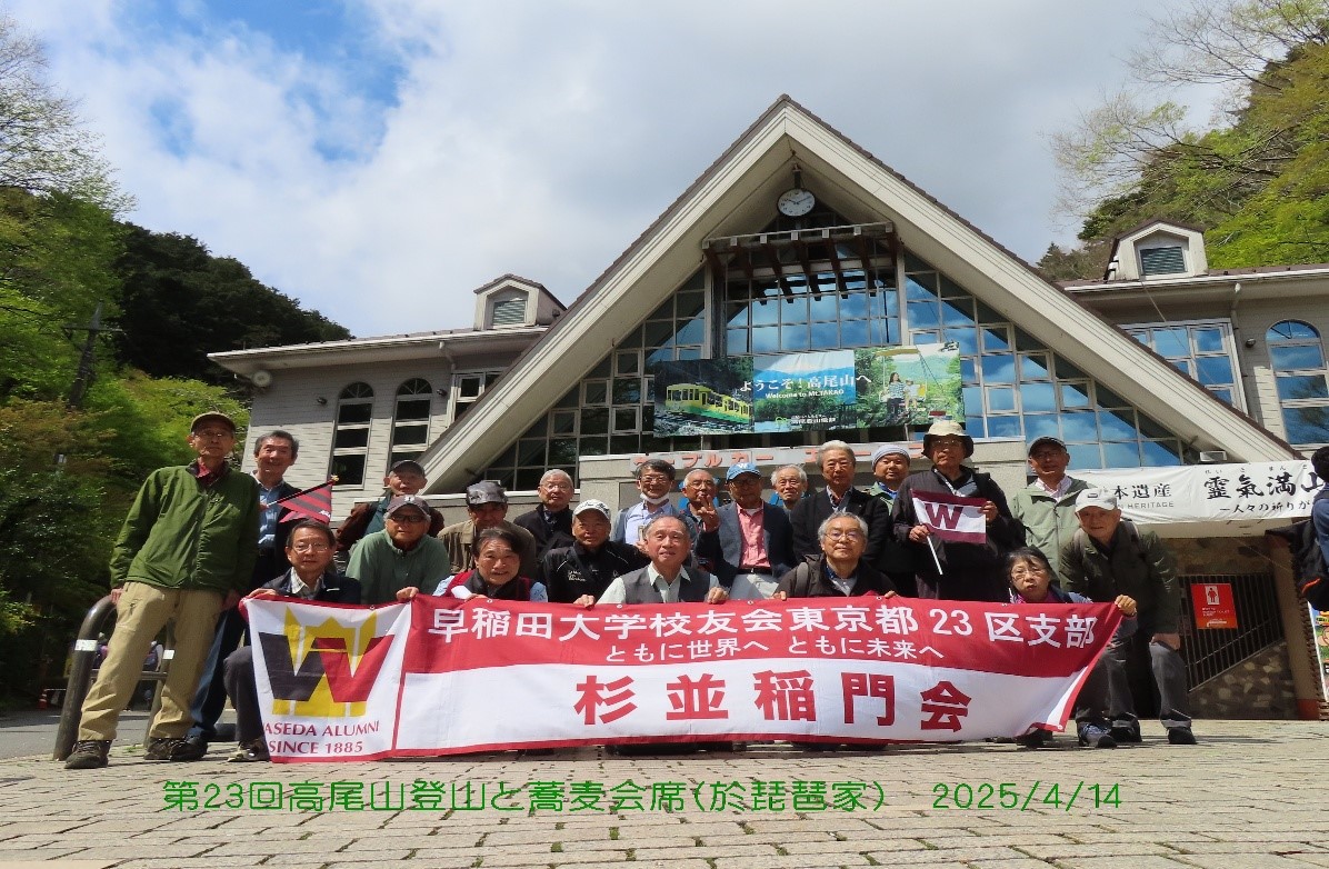 2025年4月14日(月)、杉並稲門会・第2ブロックでは「第23回高尾山ハイクと蕎麦会席の会」を開催しました。当日は、前日からの雨から一転して明るい日差しに恵まれ、集合時間には少し汗ばむくらいの絶好の登山日和となりました。京王高尾山口駅前に集合し、健脚、ゆっくり、ケーブルの3班に分かれて、登山を開始しました。今年は満開が遅れて桜がまだ少し残る中、登りは沢登りを含む「6号路コース」で山頂に到着、中にはケーブルの高尾山駅経由で、4号路、つり橋を渡って山頂というグループもいて、自由に高尾山を楽しみました。