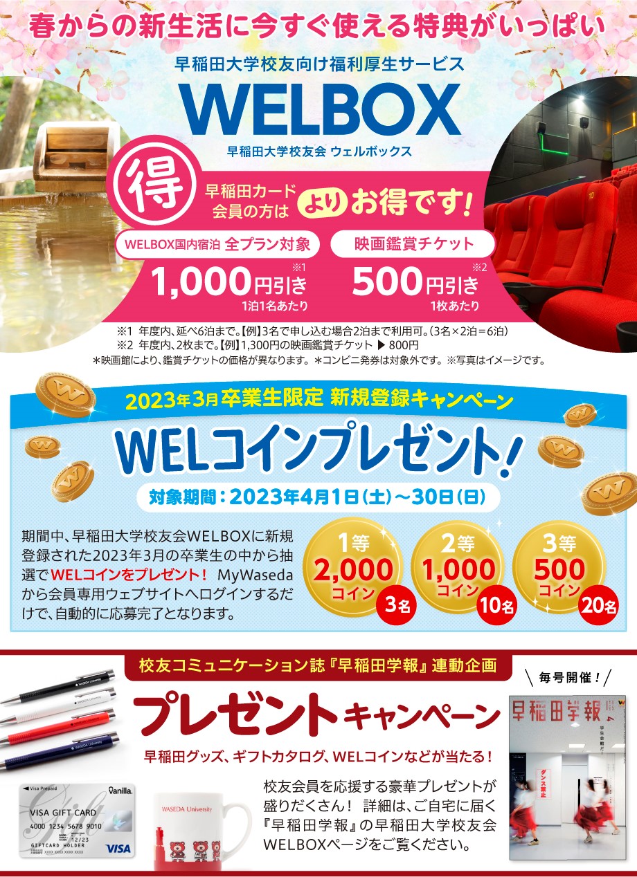 早稲田大学校友会福利厚生サービス「WELBOX」では、2023年3月に卒業される方に向けて、新規登録キャンペーンを行います。
