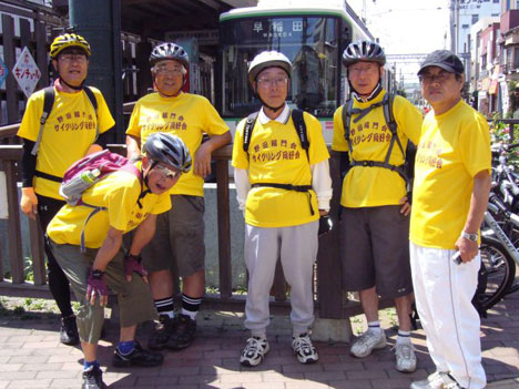 当日は山根会長、横山幹事長のお見送りで9時30分野田市を出発。まずは越谷市役所経由で日光街道をひた走り。北千住で昼食後、都電荒川線三ノ輪で早稲田行きの電車をバックに記念写真を撮り再びペダルを踏む。その後六義園・東大赤門を通過・外堀通り・新目白通りをひた走り早稲田に15時40分に到着。