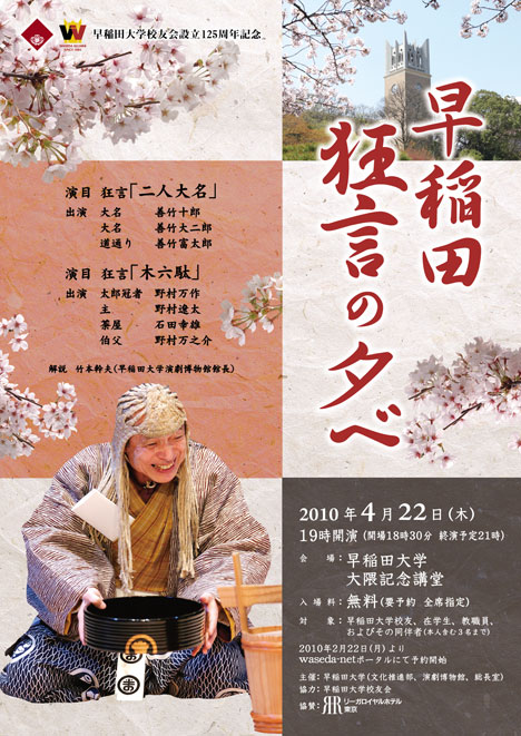 早稲田大学校友会は2010年度に設立125周年を迎えます。これを記念し、2010年4月22日、大隈講堂にて、「早稲田狂言の夕べ」が開催されました。今回の演目は、重厚な構成の中に庶民の生活感情も描かれた秀作『木六駄』、室町当時の世相や風俗もうかがえる楽しい作品『二人大名』です。