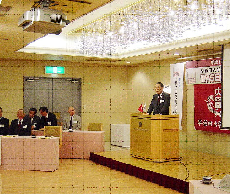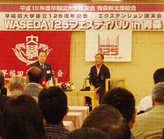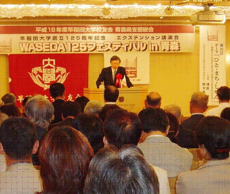 最初に映画「第二世紀宣言」を上映し、その後に新学生歌「早稲田の詩」の紹介を行い、続けて白井総長が「創立125周年を迎えて」と題し、講演を行いました。次に、「人・街・自然」〜青森から生まれるもの、世界から生まれるもの〜と題して、佐々木誠造青森県支部長(青森市長)と写真家の浅井愼平氏との対談が行われました。