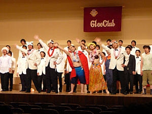 早稲田大学校歌「都の西北」、グリークラブソング「輝く太陽」に始まり、迫力溢れる男声合唱が続き、パフォーマンスや小道具を盛り込んだステージが繰り広げられた。サービス精神いっぱいのプログラムは、子どもも一緒に楽しめる内容で、観客は歌とともに笑い、学生たちの合唱に暖かい拍手で応えた。その感動はどれほどのものだったか・・・・・・。拍手渦巻くエンディングの中、会場からの「ありがとう!」の掛け声がはっきりと物語っていた。