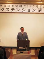 副支部長の伊藤碩彦氏から、早稲田大学創立125周年を記念して、早稲田の知的・人的財産を各地域に還元する目的で開催すること、また大学トップクラスの実績を有する卓球部にたくさんの技術を学んで欲しいとの挨拶があり、教室がスタート。