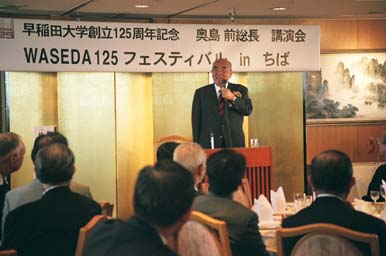 「千葉県稲門祭」はホテルニューオータニ幕張に於いて、第1部をエクステンション講演会・寺島実郎客員教授の「世界潮流と日本」講演に、一般市民の方も含め定員350名を超える参会者が集り、超低金利の日本経済の今後の懸念される動向・課題を分かり易く解説され、参会者は熱心に聞き入っていた。
