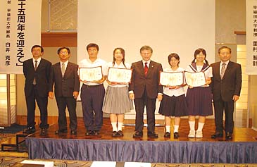 創立125周年記念事業として、大隈さんが子ども時代に登って遊んだという縁の「マキの木」を奥島前総長、秀島市長、野中佐賀県支部顧問、地元代表の6名の方の手により記念植樹しました。このマキの木が大隈さんの功績を次の世代に継承するともに、早稲田大学の第二の建学のに向けて飛躍のシンボルとなることを願っています。