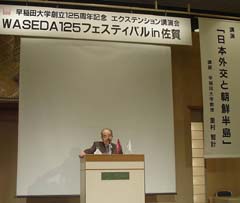 大隈記念館にある大隈重信像の前に会場が作られ、神事が行われました。大学の代表として奥島孝康前総長が玉串奉奠を行い、関係者一同それに倣いました。続いて大隈記念会保存会理事長・秀島敏行佐賀市長から「今後ますます大隈候の顕彰に努めたい」との挨拶があり、校友の薩摩琵琶奏者、北原香菜子さんが奉納演奏を行いました。続いて、奥島前総長が「築地梁山泊と大隈重信」と題し、近代日本建設のために奔走した大隈さんの精神を称賛し、伊藤博文らと私邸で語り合ったエピソードなど明治の政治家らとの交流についての講演を行いました。熱のこもったお話の内容に時間を忘れるほどで、もっと聞きたかったとの声が多くありました。