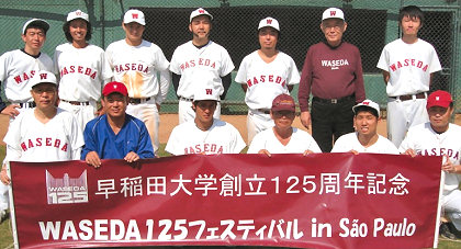 5月13日に行われたブラジル早慶戦は、投手陣の力量の差を反映し、何時もの状況が全く逆転した22対10の大差で、慶応側に勝利を譲りました。今年は母校創立125周年の記念すべき年に当り、我々も 「WASEDA フェスティバル in Sao Paulo 」の横断幕を作って応援に臨みましたが、我が方は有力投手の帰国が災いして戦力が急激に低下し、故若林雅之介元会長のお孫さん、3世のガブリエル君の援助出場もありましたが、硬球と軟球の違いに戸惑って実力を発揮することができず、涙を呑みました。