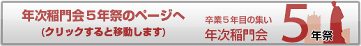 早稲田大学校友会が主催する卒業5年目・10年目の集いが、「年次稲門会5年祭・10年祭」です。同期の年次委員を中心にパーティの準備を進めます。週末の午後のひとときを懐かしいお仲間とお過ごしください。ご家族揃っての参加も大歓迎!!