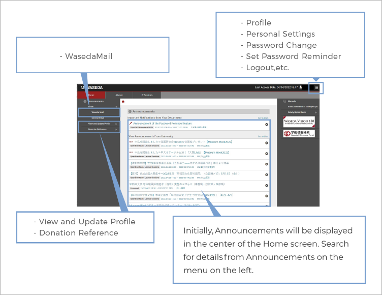 MyWaseda is a Waseda University portal site available for use by Waseda University Alumni Association members (graduates, faculty/staff alumni, specially recommended alumni, and honorary doctors).