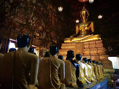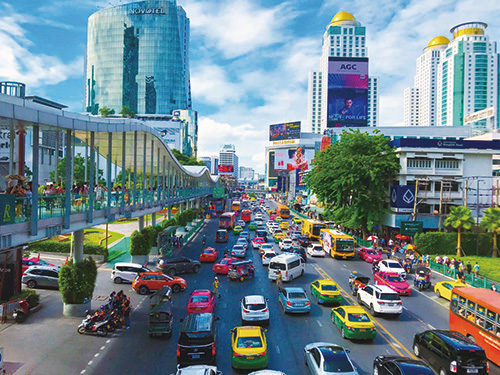 Many temples and Buddha statues in Thailand are gold or of bright colors. Downtown Bangkok. Traffic congestion is a constant source of concern.