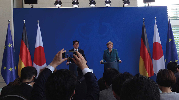 A press conference with Chancellor Angela Merkel when Prime Minister Shinzo Abe visited Germany in April, 2014