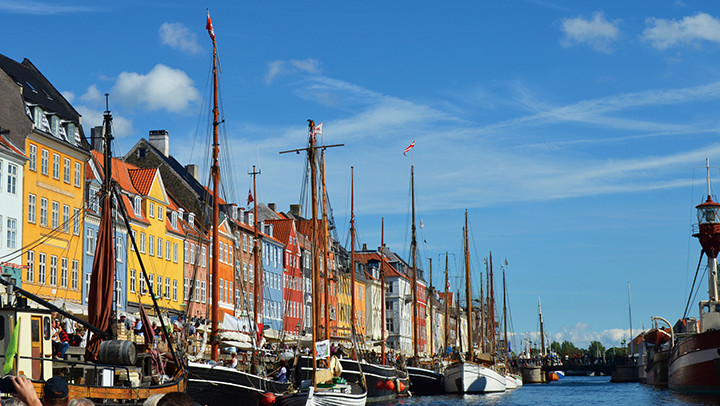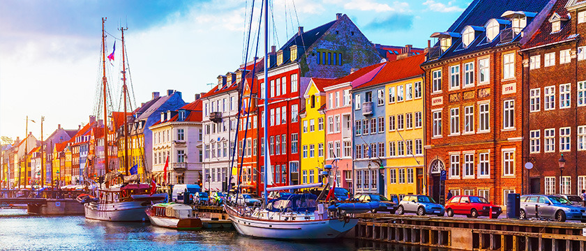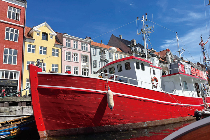Nyhavn, a sightseeing area of the Danish capital, Copenhagen Colorful buildings and a boat in Nyhavn