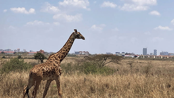 A giraffe in Nairobi National Park against the backdrop of clusters of high-rise buildings The business district and Nairobi Expressway leading to the airport