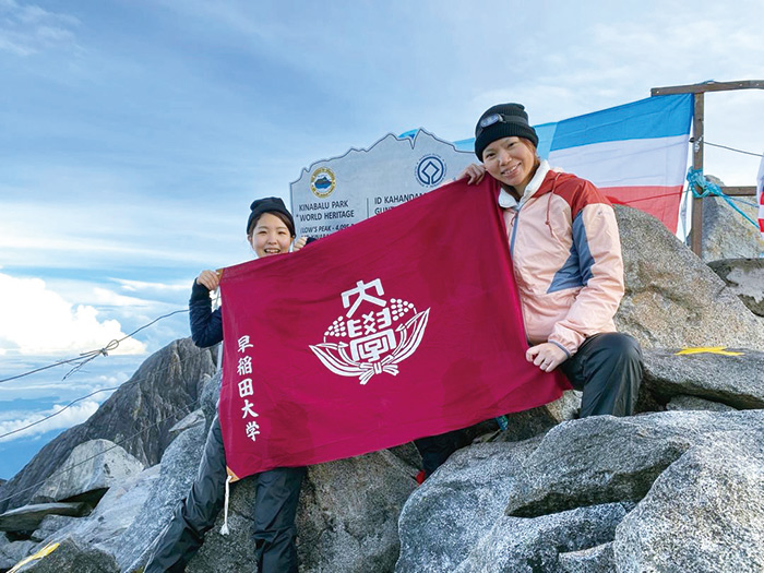At the top of Mt. Kinabalu, which is more than 4,000 meters above sea level Members making double peace signs at a Tomonkai friendship golf competition