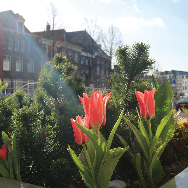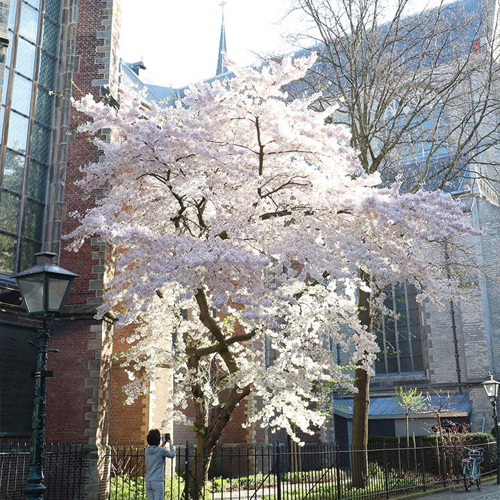 Streetscape of Leiden and tulips A church and cherry blossoms in Leiden