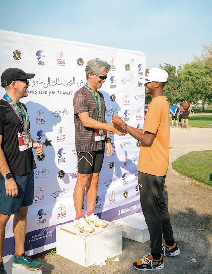 The author was given a trophy by Mutaz Essa Barshim, the gold medalist in the men’s high jump at the 2020 Tokyo Games. Mutaz Essa Barshim appeared as a surprise guest when the author won the 10-kilometer race held in Doha.