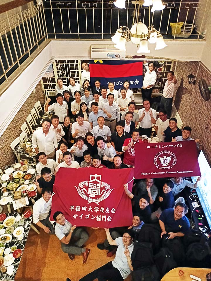 The Saigon Tomonkai holds various events, such as regular quarterly social gatherings, golf competitions, and “minimon (small gate)” meetings, mainly for young members. We proactively engage in several activities to help Waseda graduates (alumni) living in Vietnam become better acquainted with each other. Waseda alumni have a strong presence in the Japanese community in Ho Chi Minh City. For example, of the 60 participants in a recent joint party among the three universities of Waseda, Keio, and Sophia, more than half were Waseda alumni, reflecting our strong presence in the city. In a recent Waseda-Keio golfing match, the Waseda team won all three divisions.
