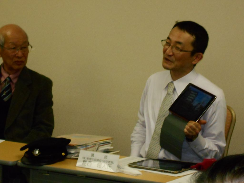 その後、1994年教育学部卒業の葛西暢人氏に「共有される記憶-早稲田の最大公約数」と題して講演していただいた。講師は大学入学から今日まで大学院・大学講師・学報の編集などに携われ、過去現在の図書館・学食などを体験された話や、入学式の変遷(回数)、東西線が開通したことによる通学方法の変更、グランド坂付近の変遷、理工学部のキャンパンの竣工、早稲田界隈の変遷、学帽利用者が減少している状況など、iPadを活用し、写真や話題を提供いただいた。出席者一同学生時代を思い出し、学生時代にかえって、講師ともども「どこどこになにがあった」「あの当時はどうだった」という会話が飛び交い、過去の話題で盛り上がり、楽しい時間・空間を過ごした。