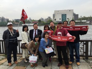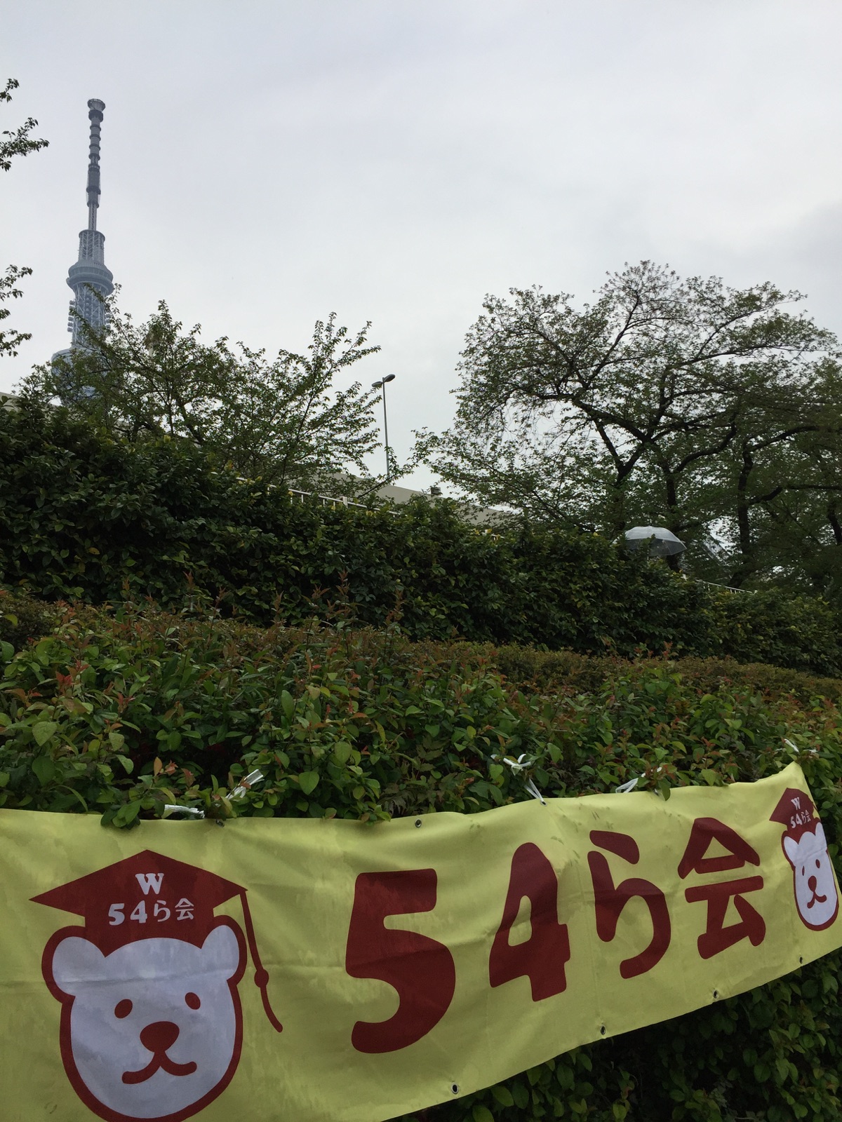 2015年4月19日(日)、毎年恒例のプチ54ら会「早慶レガッタ応援」を開催しました。対抗エイトが3連敗と分が悪い早稲田ですが、54らのメンバーである内田監督のもと、今年こそ必ず勝利!と信じ、ゴールである桜橋の墨田区側応援席に、54ら旗のもと15名が集まりました。
