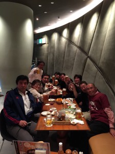 懇親会は、吾妻橋にある有名なオブジェ「金の炎」の下の「フラムドール」で。店内は、やはりレガッタ応援後のグループでいっぱいでした。今年も結果的には残念でしたが、美味しいアサヒビールに乾いたのどを潤し、今年度初の早慶戦を応援する楽しいひとときを味わうことができました。