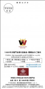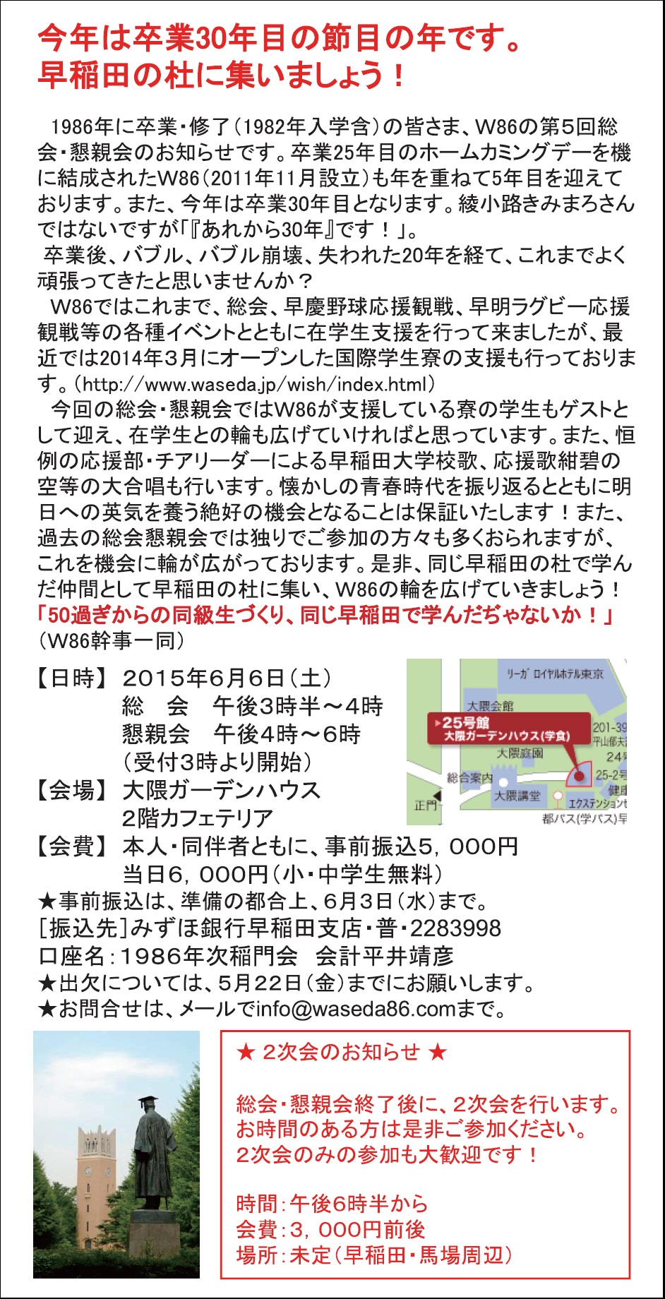 1986年に卒業・修了(1982年入学含)の皆さま、W86の第5回総会・懇親会のお知らせです。