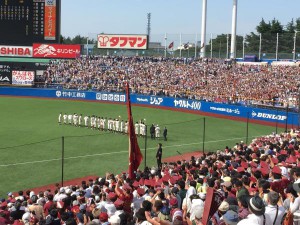 校旗入場で「カンパーイ!」、エール交歓の直後、試合開始で「カンパーイ!」。もちろん点が入って「カンパーイ」とかやっている間に、早稲田は1点先行、2点取り、最終的には4点取っての完封大勝利!!