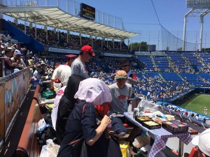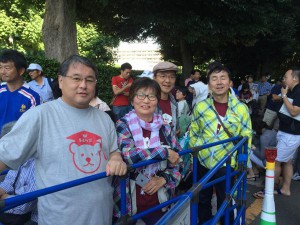 ファミリーシート占有にあたっては昨年から「席取挺身隊」が結成されています。今年も藤瀬隊長以下、気合充分の4名が前日12時および当日の7時半に並び、先頭列の1番2番3番4番を独占した次第です。