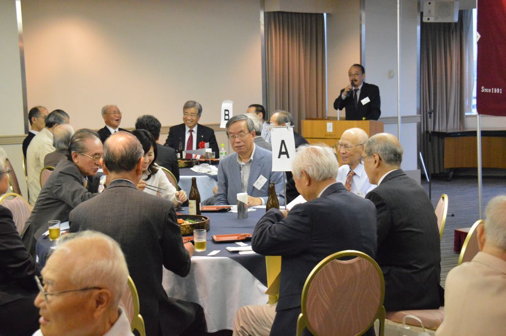 第3部の懇親会は9階に場所を移し、横田会長のあいさつの後、嶋村様と杉並稲門会会長久保田様にごあいさつをいただいた。塚田様の音頭で乾杯、歓談にうつった。合間には福引券付稲門祭記念品の販売、8月29日(土)に開催予定の納涼会の紹介があった。また、「地域サポート活動部会」による募金も行われた。