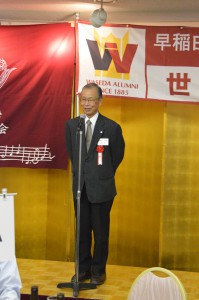 続いて、来賓の早稲田大学 常任理事守田好秋様、早稲田大学地域コーディネーター嶋村貴志様の紹介の後、守田様からごあいさつと大学の現況などの報告があった。