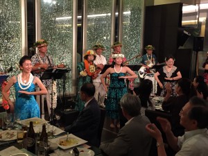 毎年恒例の中小企業診断士稲門会、中小企業診断士三田会の合同懇親会が2015年9月12日、目黒雅叙園のクラブラウンジで行われました。三田会会員の先生がリーダーを務めるハワイアンバンド「クールアイランダース」のライブを聴きながら、早慶診断士の親交を深めました。おいしい料理とお酒、そしてフラの優雅なダンスに包まれた会場は、まるでハワイのサンセットディナーのようなリラックスした雰囲気でした。