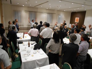 質疑応答でも現状の政治状況から回答が難しいデリケートな問題も含めて活発な意見交換が行われた。最後に樋高剛氏(1989年社学)の音頭で恒例の校歌を斉唱し、同氏に今後の活躍を期待するエールを送って午後8時半に散会。