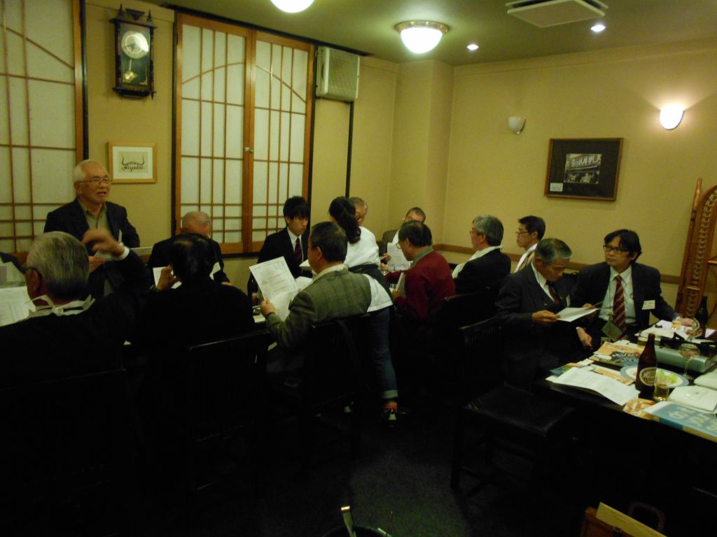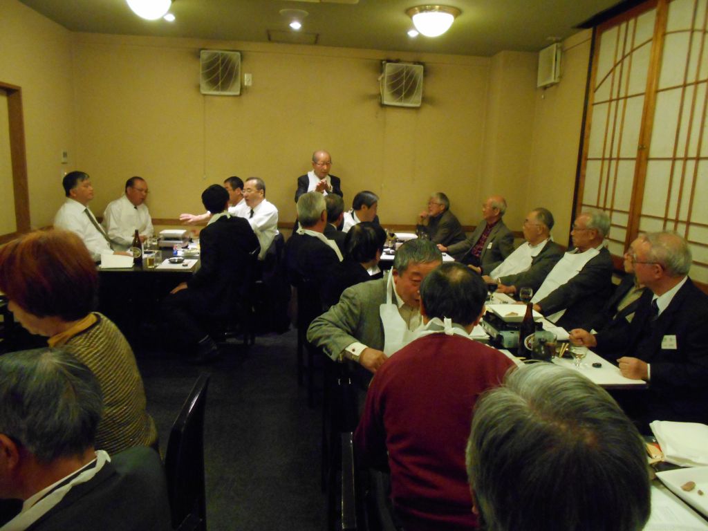 2015年12月21日(月)みやだい倶楽部にて午後6時半より忘年会を開催。島岡会長のあいさつと乾杯、幹事長から報告と各種連絡に続き、2012年から商議員として活動していただいた竹内誠一郎氏(30理工)からその活動を通して得られた大学の動向などについての報告のあとに忘年会はスタート。