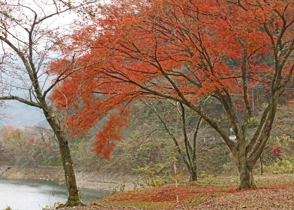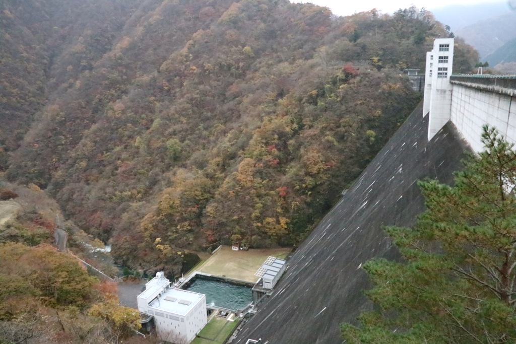 次に見学者用に作られた小河内ダム堤体上にある展望タワー(鉄筋コンクリート造り4階建て)に上る。「よくぞこの場所を選んだものだ」と感心した。堤体の下流側はその背面や発電所から吐出された水流や多摩川の清流など絶景。とくに堤体背面からの上昇気流に乗って舞い上がる木の葉のサマにしばし見とれた。堤体前面側はまわりの山々の紅葉、湖面の輝き等々、普段の生活では目にすることのできない見事な光景であった。(山崎氏は写真撮影のため帰路中途から別行動)