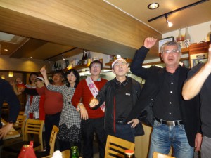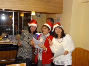 ビンゴ大会のBGMとして、サンタクロースの帽子をかぶった10名程の聖歌隊が歌声を披露しました。『聖しこの夜』、『White Christmas』、『赤鼻のトナカイ』の男声女声3部合唱です。村山隊長から、各自自主練習をするようにと事前に楽譜が送られ、カラオケルームでの特訓の成果もあったはずですが、すでにお酒が入ったあとだったので、果たして合唱になっていたのかどうかと反省。